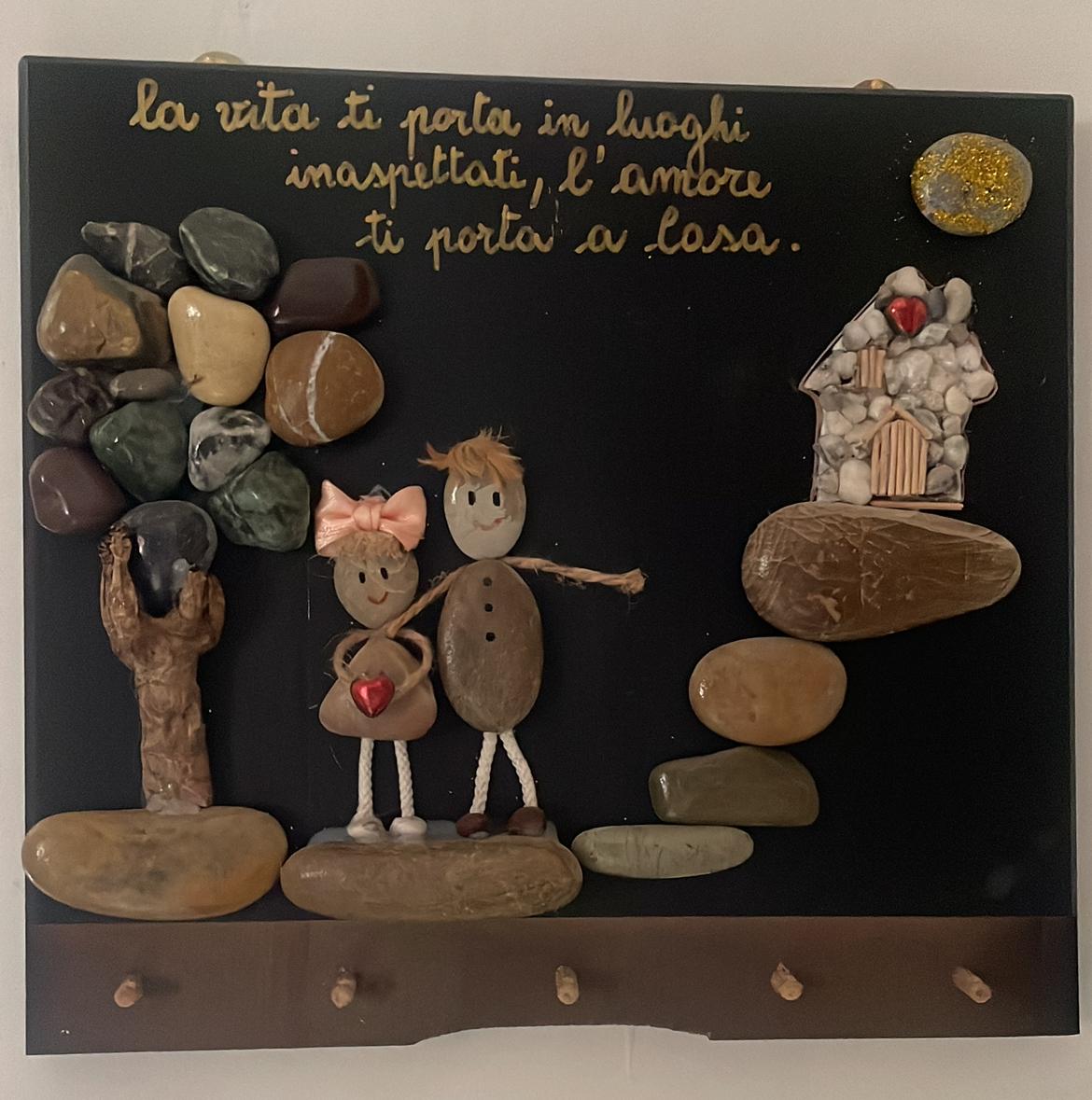 Ogni opera nasce da materiali semplici — pietre, legno, fiori secchi e piccoli elementi di riciclo — che insieme raccontano storie di vita, amore e ricordi.